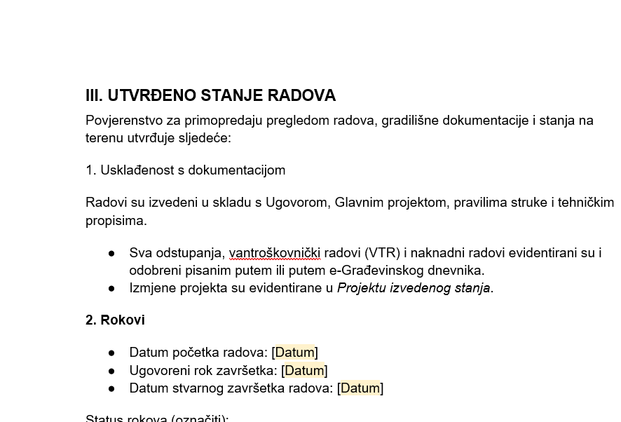 Bez kvalitetnog zapisnika, investitor vas može tražiti popravke mjesecima nakon useljenja ili odbiti isplatu “okončane situacije”. Ovaj profesionalni predložak jasno podvlači crtu i definira stanje objekta u trenutku predaje.
